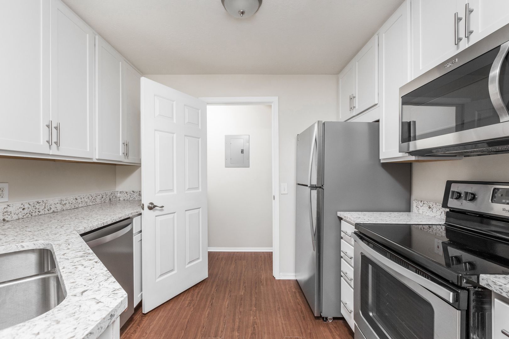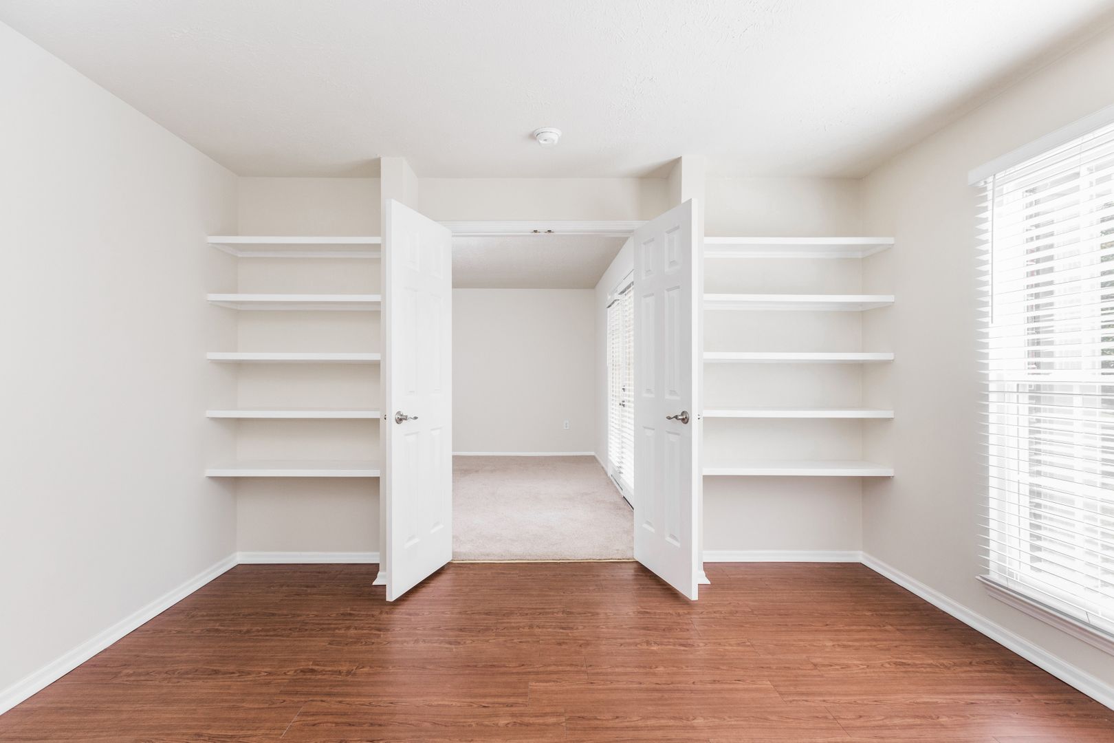 This spacious one-bedroom apartment has a private study with built-in bookshelves and double French doors conveniently opening to the living room.