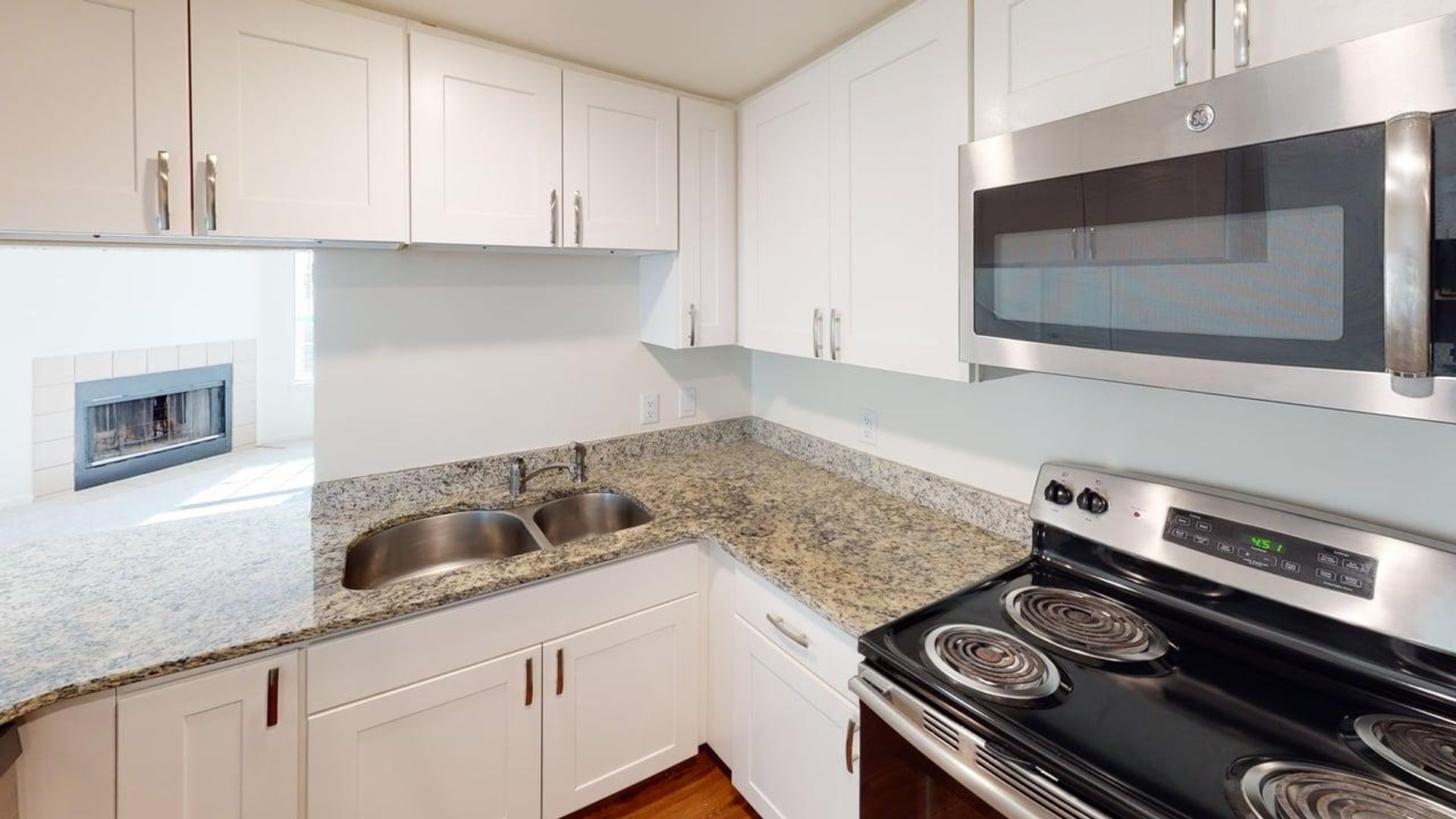 Refined upgrades, including white soft-close cabinets and granite countertops throughout, new doors, a built-in microwave, and an updated lighting package.