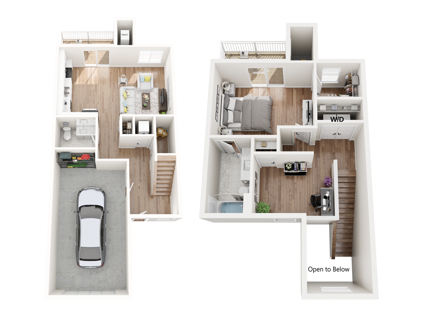 Welcome to The Clover Townhome, a beautifully designed two-story residence that blends spacious comfort with modern luxury. This thoughtfully crafted layout features elegant wood-style flooring, sleek quartz countertops, and a stylish electric fireplace, creating a warm, inviting living space. Large windows and an open layout enhance the home's bright, airy feel. Designed for both convenience and functionality, The Clover includes an attached private two-car garage, in-unit washer and dryer, generous closet space, and additional exterior storage. The well-appointed kitchen comes fully equipped with modern appliances, including a dishwasher, microwave, ice maker, garbage disposal, refrigerator, and full stove and oven, making everyday living and entertaining effortless. Enjoy private outdoor living with both a patio and balcony, perfect for relaxing or hosting, along with everyday comforts such as air conditioning, ceiling fans, and included Wi-Fi. With free high-speed internet and parking included, The Clover Townhome offers a refined, low-maintenance lifestyle with the space, finishes, and conveniences designed for elevated townhome living.