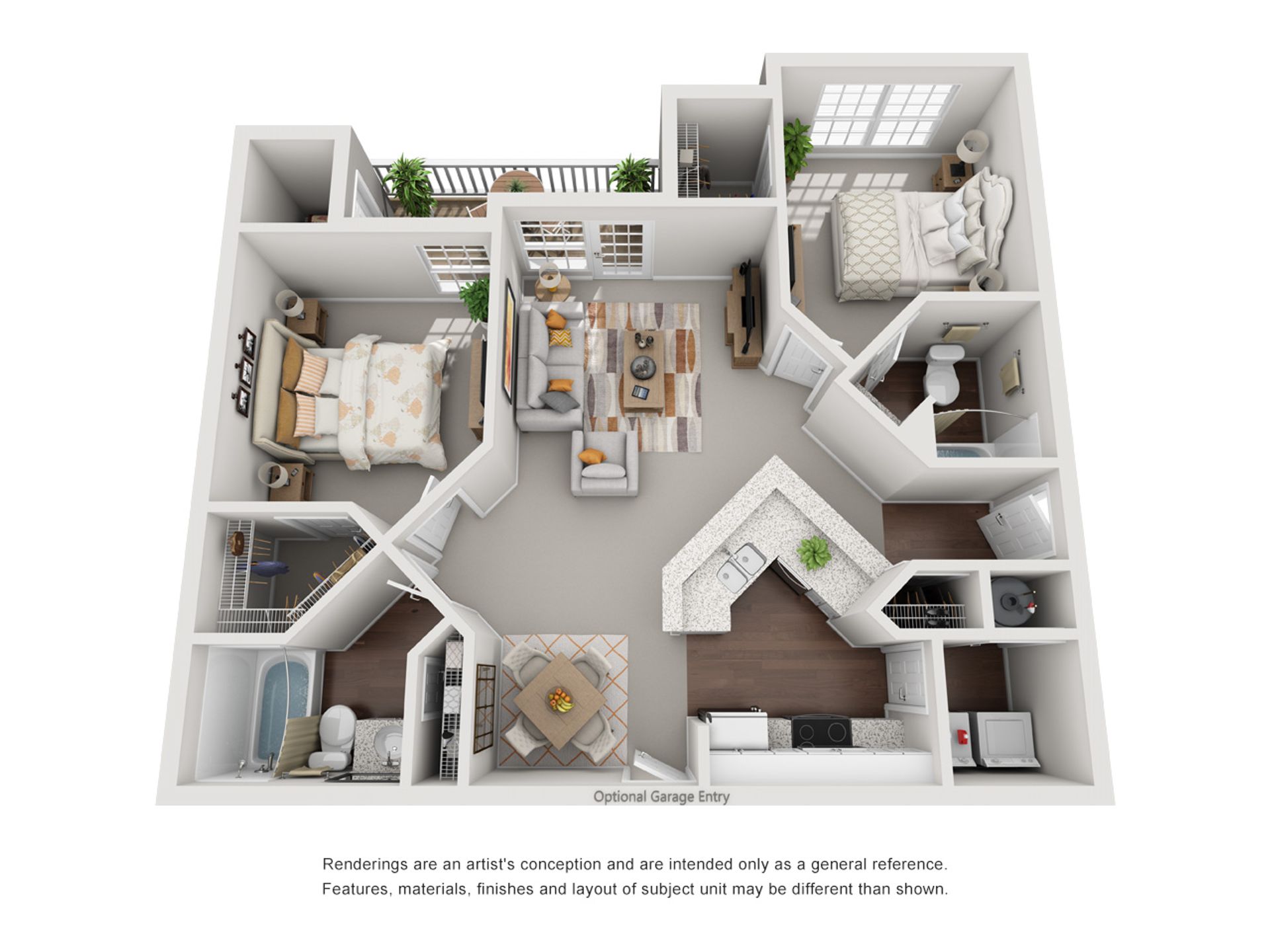 The Cheltenham is a charming split-bedroom floor plan. The bedrooms are equal in size and measure a generous 11.0 x 11.6. This apartment measures 988 square feet and contains two full bathrooms, as well as a washer and dryer.