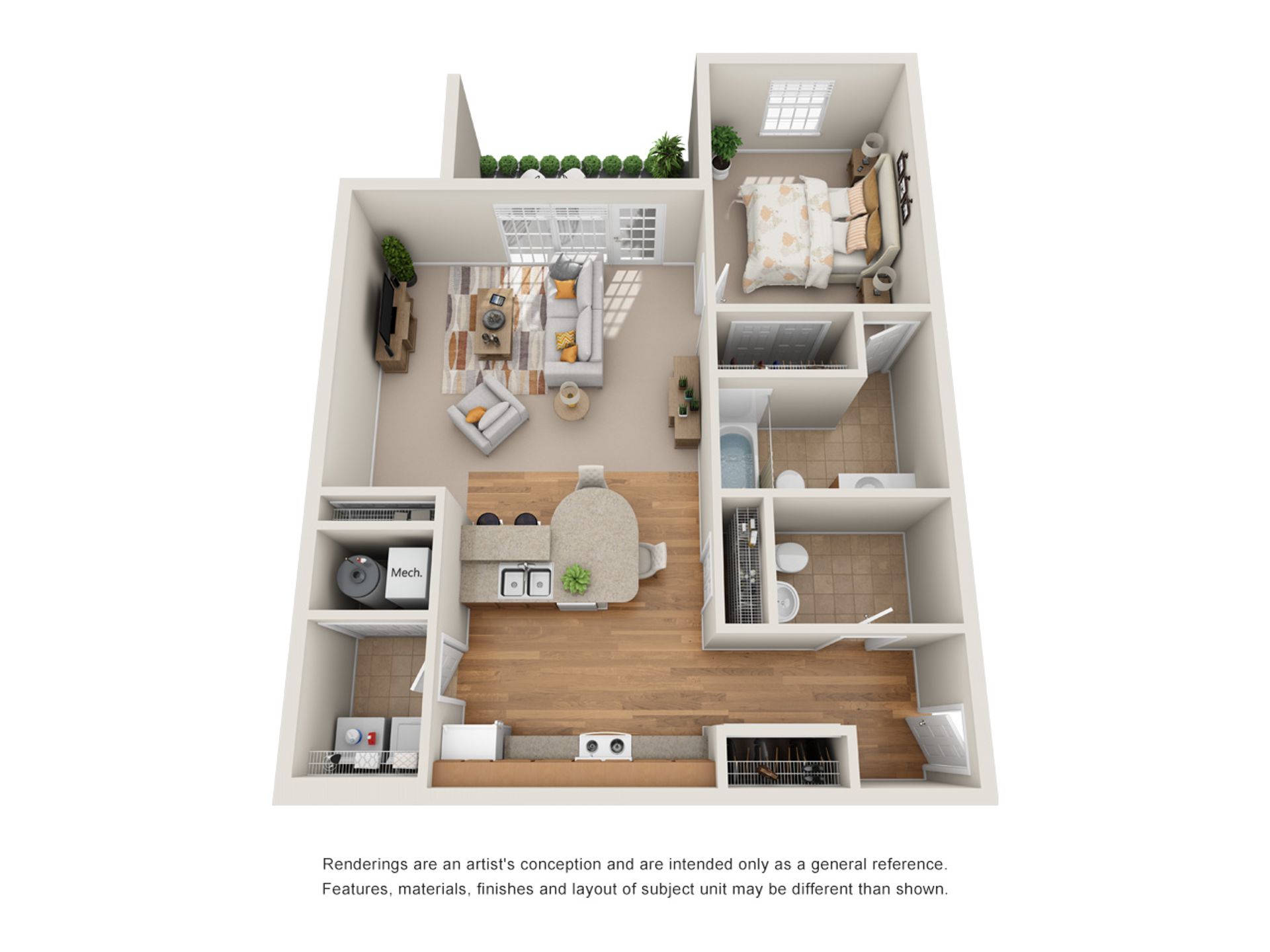 Charming and spacious living area with 9-foot ceilings throughout. Cherry oak colored cabinets and white appliances in the kitchen give a natural warmth to the space. Limited lake view options are available for an additional $40/per month.