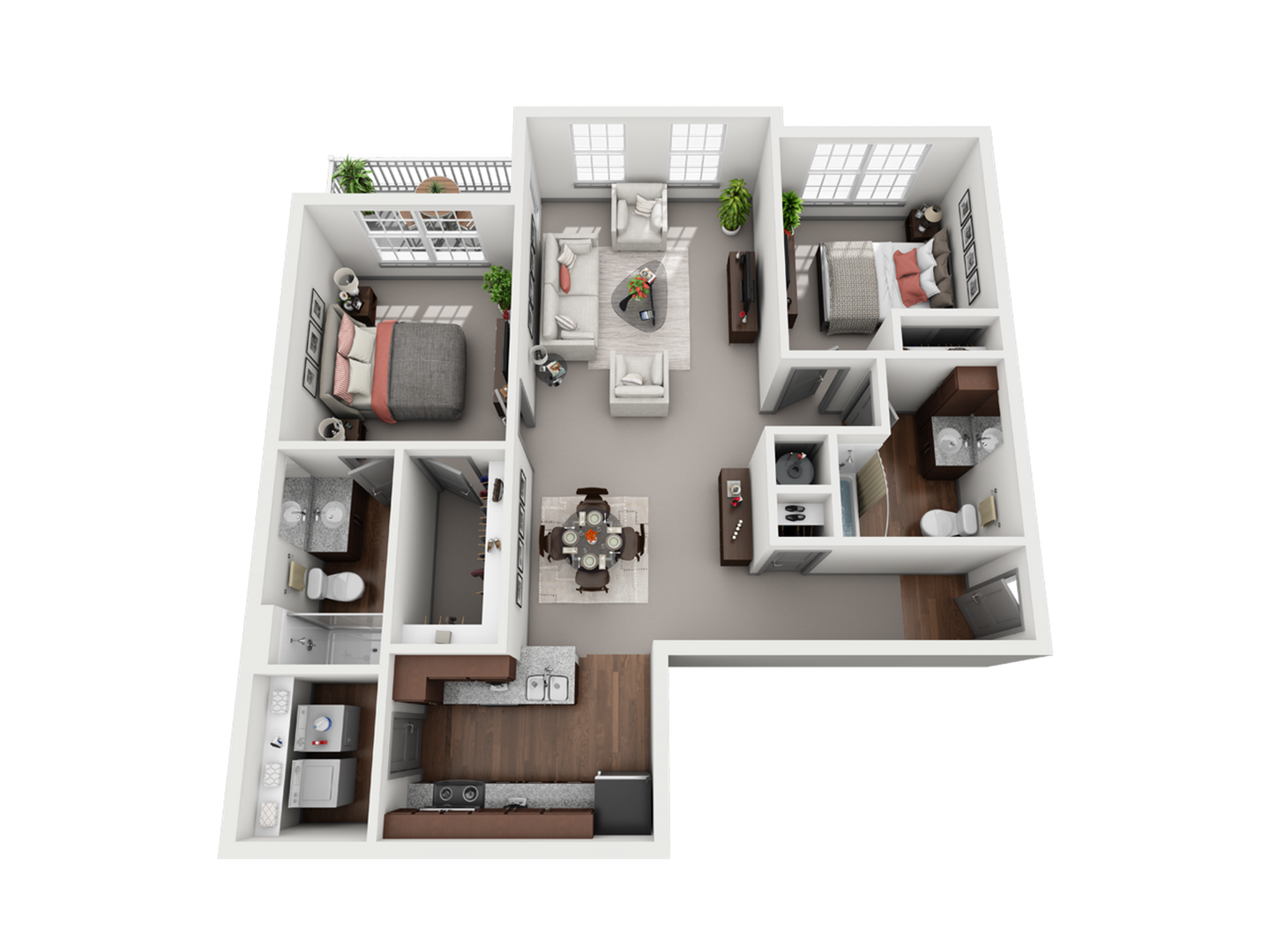 This spacious two-bedroom floor plan is thoughtfully designed to balance comfort, privacy, and modern style. The open-concept kitchen features granite countertops and stainless steel appliances, flowing seamlessly into a bright living and dining area highlighted by vinyl plank flooring and ceiling fans. Both bedrooms offer generous closet space and comfortable layouts, while the well-appointed bathrooms include a walk-in shower for a spa-inspired feel. Enjoy the convenience of an in-unit washer and dryer, unwind on your private balcony or patio, and take advantage of included valet trash service. Pet-friendly and beautifully designed, this home delivers an elevated living experience with everyday ease.